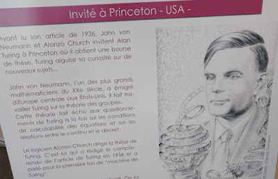 Samedi dernier, dans le cadre de la fête de la science, j'ai assisté à une conférence sur la cryptographie à la médiathèque de Bures sur Yvette. L'auteur, Genma, a promis de mettre sa présentation sur son blog [1]. Dans le hall, les panneaux sur Alan Turing méritaient le détour. Ils illustreront donc ce billet.