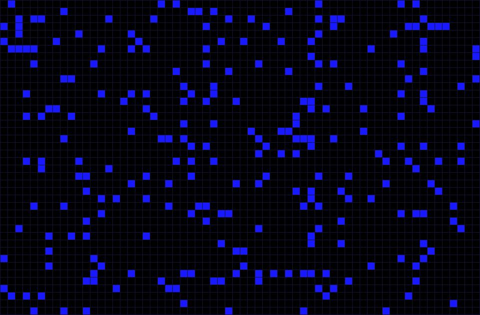 Si la probabilité de devenir une civilisation colonisatrice est de 0.1, notre galaxie en 2D pourrait ressemble à ça. Une civilisation colonisatrice (le carré jaune), pourrait donner naissance à une seule autre civilisation colonisatrice (le carré jaune à côté). Tous les carrés noirs sont des civilisations qui restent sur leur planète. Donc si p=0.1, nous ne sommes pas seuls dans l'univers (il y a plein de carrés noirs), mais il y a trop peu de civilisations ayant envie de nous coloniser pour que nous ayons de la visite.